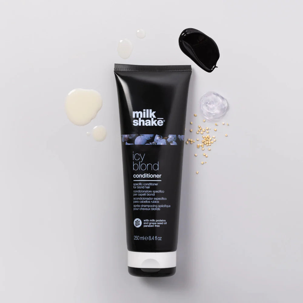 milk_shake Icy Blond Conditioner er hannað fyrir mjög ljós eða platinublont hár. Það inniheldur sérstakt svart litarefni sem hjálpar til við að draga úr óæskilegum gulum eða brass‑tónum og gefur hárinu kaldari, silkimjúkri áferð.